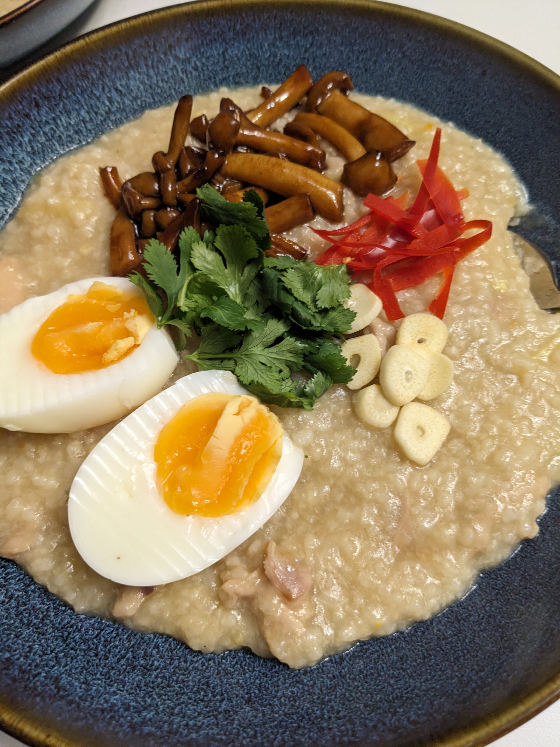 If you can believe it, I’d never actually made congee for myself. This chicken congee is an amalgamation of different things but I combined a very basic chicken congee with some mushroom sauteed in a flavorful soy mixture and tried to make jammy eggs (I’m never fast enough they’re always 30-60 seconds over somehow). While I actually struggled making this because there’s a lot of “rules” and it was unclear how many of them I could break, it still turned out great and we really enjoyed it. If I made it again I’d definitely make it in a bigger pot because my rice mixture boiled over the edge twice and made a mess but otherwise as you can imagine a rice porridge with chicken, ginger, and very flavorful mushrooms is delicious. It was also extremely filling.