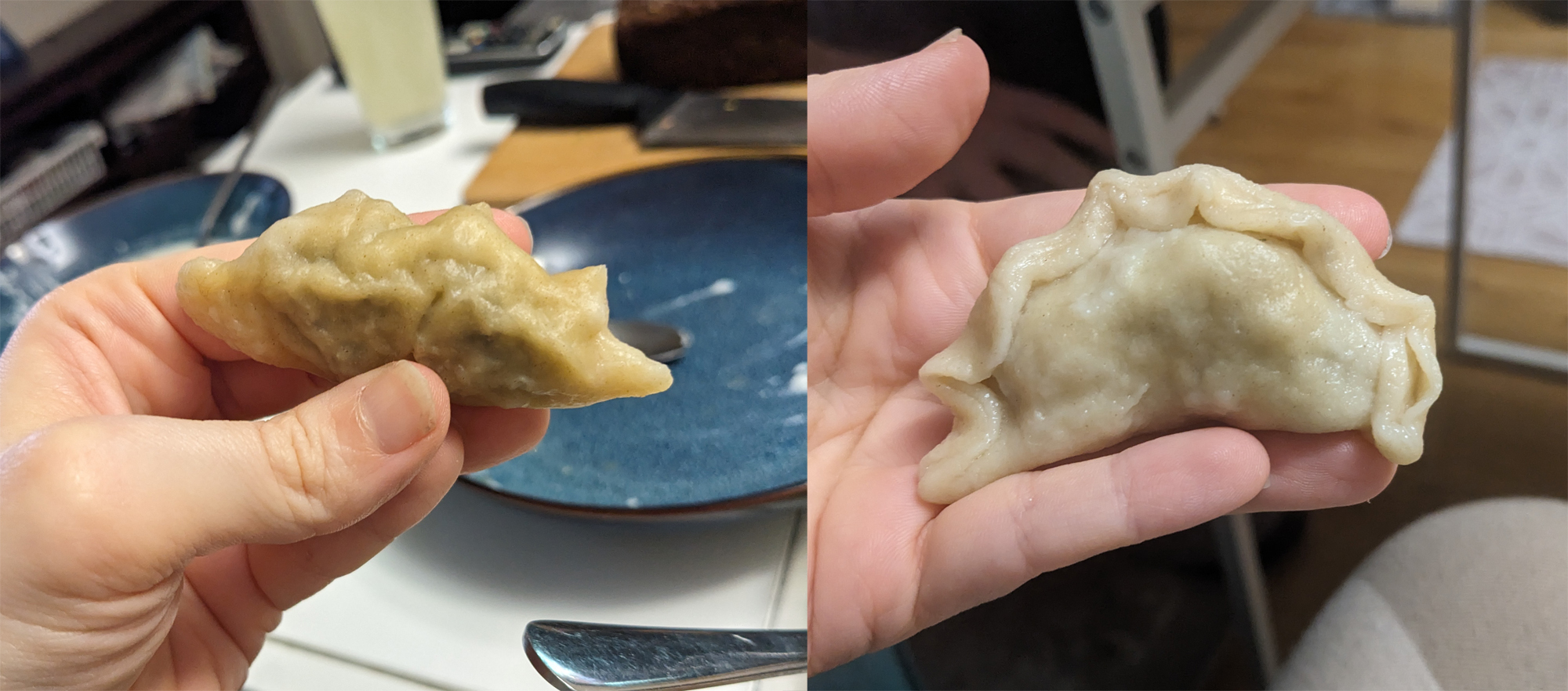 I ended up making about 80 dumplings in 2 batches. My first batch I wasn’t happy with the texture of the dough and could not figure out how to fold them (on the left). The second batch went much better and I made things almost resembling something nice! I’ve never been good at making attractive food and I suppose I don’t intend to start now. They both tasted great which is all that matters in the end!