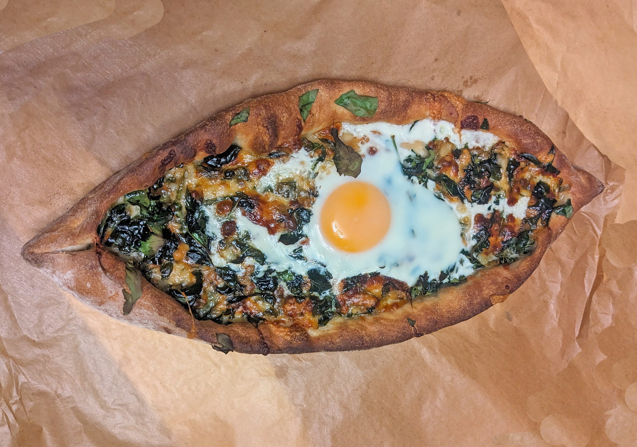 I decided to make pide, specifically ıspanaklı pide (spinach pide) for Turkey but you might notice it’s a little more boat shaped and that’s because I have a narrow oven. I should have made three long and thin boats instead of two chubby boats but it still worked out great. Pide is basically like a mix between a pizza and an adjarian khachapuri. We filled these with just some spinach, manchego, and low moisture mozzarella because I didn’t want to spend a ton of time finding a place that sells kaşar. Then I topped it with an egg that I cooked until it was perfectly runny.