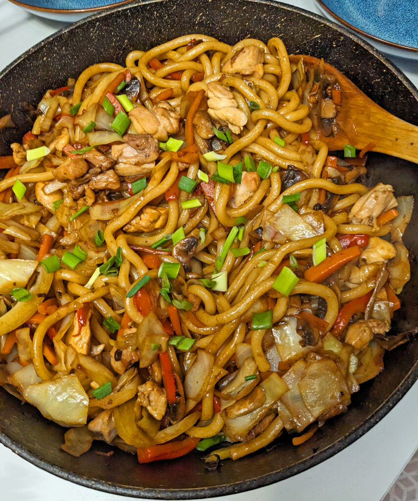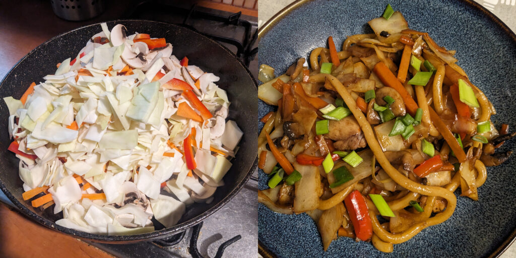 For dinner I made a very basic yaki udon with some chicken. Yaki means grilled and yaki udon is just stir fried noodles but it uses udon, generally with a bunch of cabbage and other vegetables. Udon are my favorite noodle type so I have no idea why this wasn’t already in my rotation of dinners but obviously it was delicious.