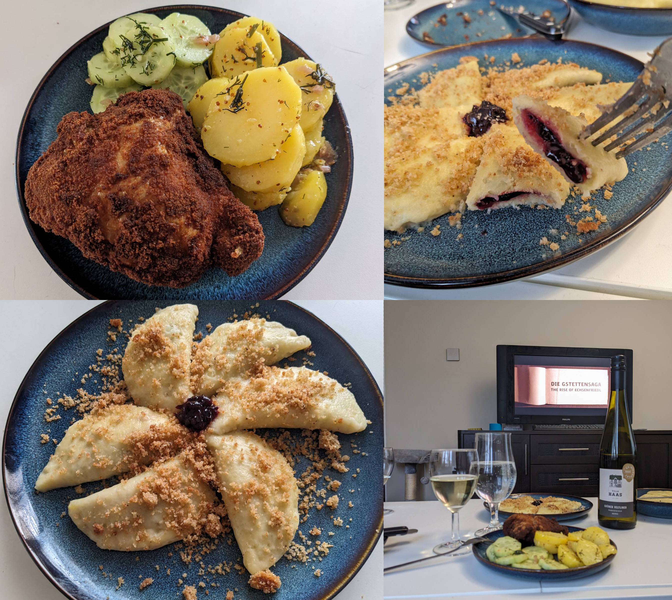 Obviously there’s quite a lot of really famous Austrian foods but I kind of became enamored with the idea that fried chicken (backhendl) actually seems to be a hyper popular dish in Austria so I decided to make that with a very traditional Erdäpfelsalat and a Gurkensalat where I cheated and used to the same marinade to save time. I don’t generally make fried chicken and this reminded me of why – deep frying is a mess, possibly dangerous, and also I ended up putting the chicken in the oven for an extra 10 minutes because it was too thick to cook through at the temperature I got my oil up to. The Austrian version is basically very simple but there’s really nothing to complain about, fried chicken is delicious and the sides were perfectly fine.