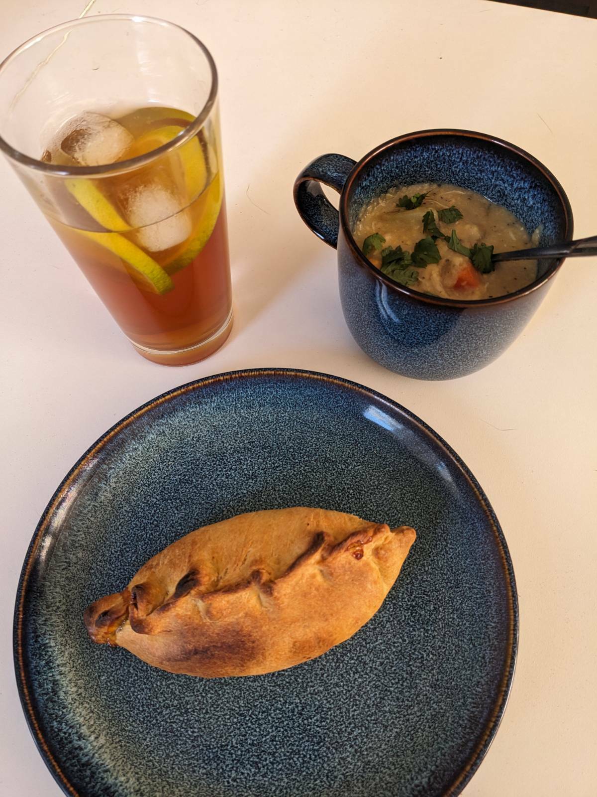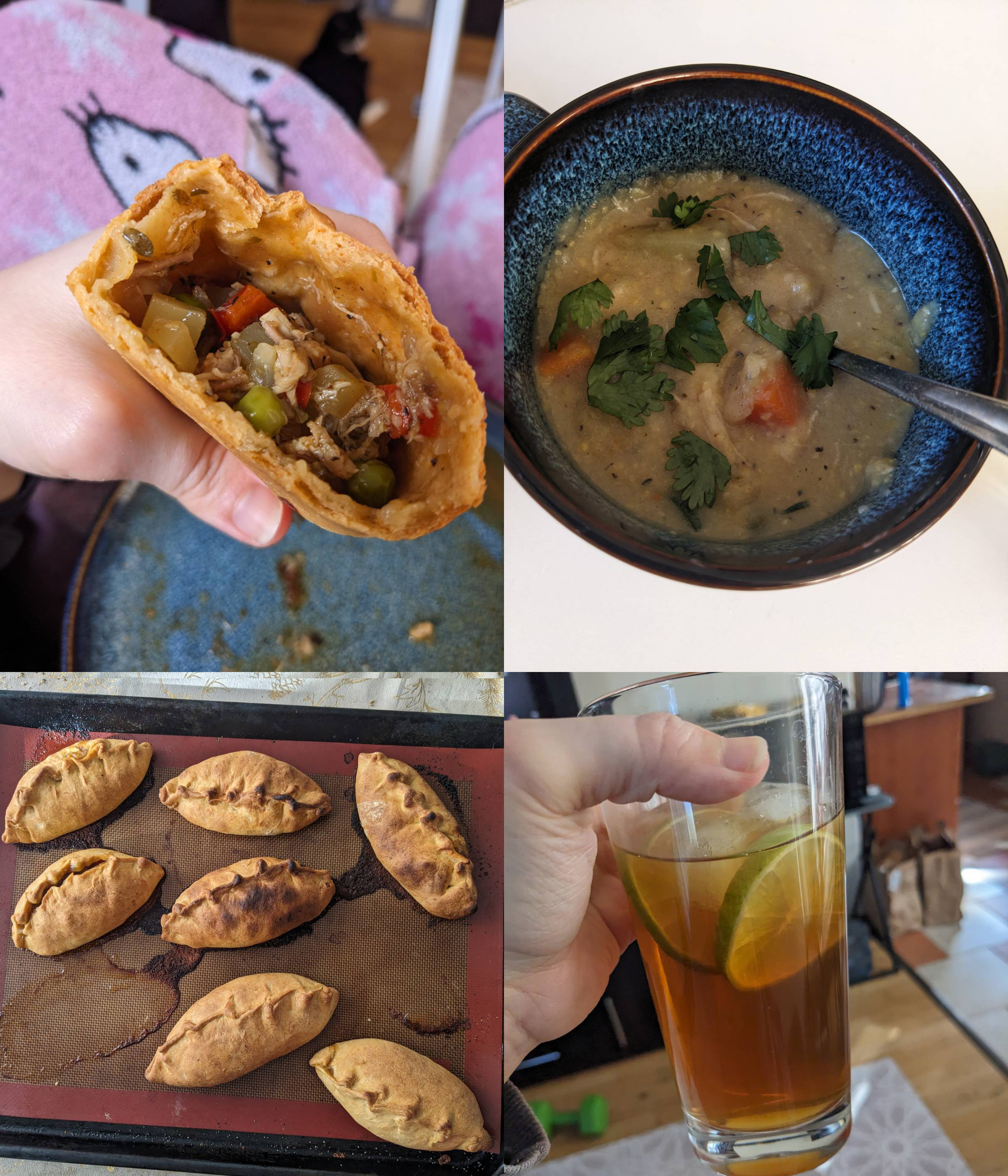I put all my energy into dinner so there wasn’t a dessert for this week but I made Salteñas de Pollo and Lawa de Jankaquipa. Salteñas are kind of like what would happen if a Xiao Long Bao [sometimes called “soup dumplings” in English] and Empanada had a baby. The inside of a the salteña has a stew mixture so if you’re like me, you will probably dump half of it on your lap. I’ve never been so grateful to be eating in my own house as when I basically spilled one of these down my shirt during the movie.
