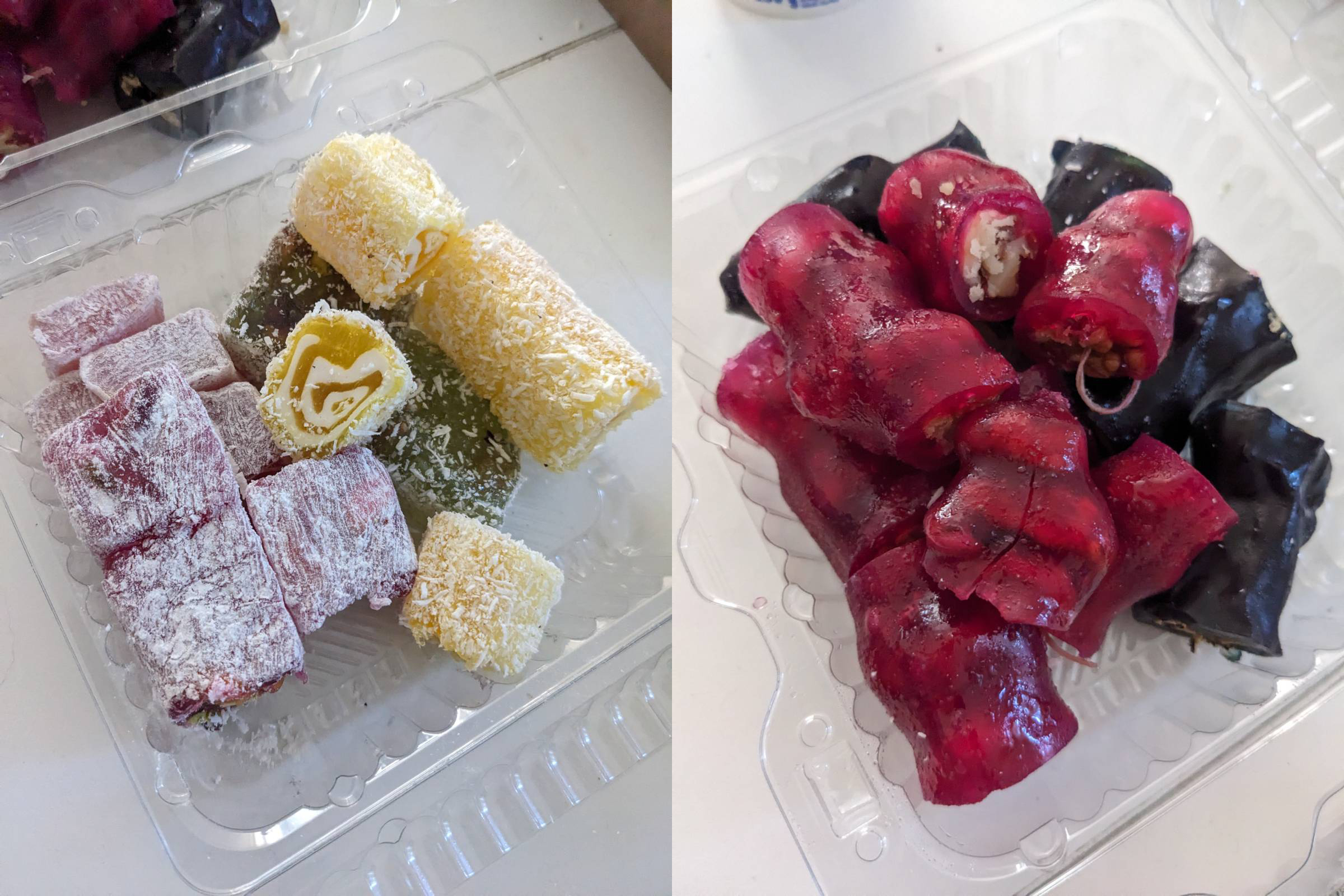 Obviously I also had to order some dessert. I got a mixed selection of lokum [also known as Turkish delight] which ranged from really good to just okay. Absolutely no idea what flavor any of these were but they were fresh because they had that extremely slippy, almost squeaky texture that fresh lokum has. If you’ve never had fresh lokum it’s completely different to the weird stale stuff you get in boxes in the US and it has a much softer texture and generally a strong flavor but is not too sweet. Half of these were rolled in coconut also which was a pretty interesting flavor pop. I also bought some churchkhela even though it’s more Georgian because my husband loves it. Churchkhela is made from grape must (the leftover byproduct of skin and seeds from making wine) and nuts. My husband loves this stuff it’s kind of like round fruit leather, I’m agnostic about it.