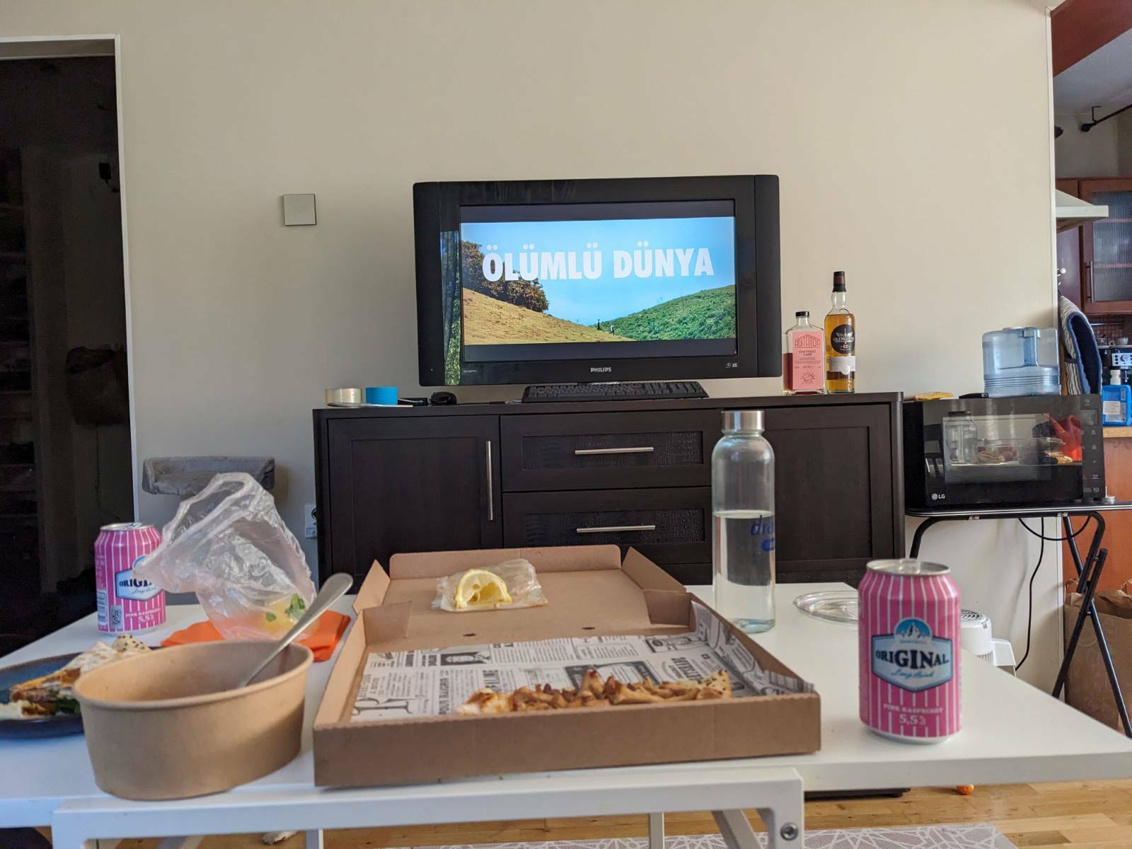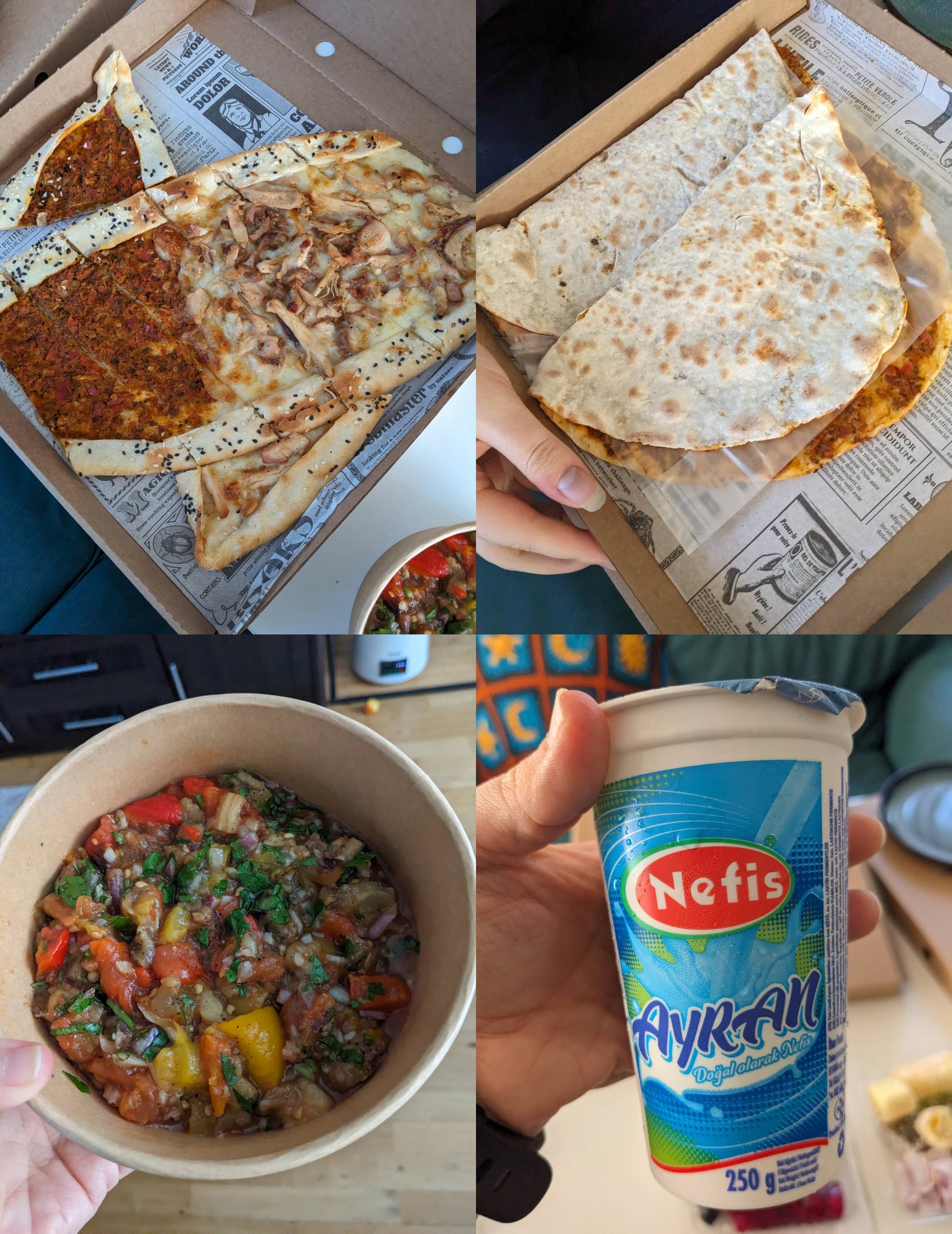 We have a couple of Turkish take out places here so I happily took advantage of that. First up is pide which was pretty good. The side with the cheese/spicy tomato mixture was just okay but with the smoked chicken it was absolutely fantastic. Also it was gigantic! It does kind of land in the area between khachapuri and pizza but that’s a great place to land. Next up was lahmacun, this one came with lots of fresh herbs and a lemon to put on top too which made it even better. Last was soslu patlıcan a kind of roasted vegetable dish that was super good on bread. It was a little sour and had a little of that smokey char taste to the vegetables making it really unique and delicious. We also got ayran the famous salted yogurt drink that is enjoyed across Turkey but sadly neither of us was huge fans of it. It is both extremely salty and also too thick for me to enjoy as a drink but too thin to dip anything into substantially but the real problem is how salty it is because that apparently immediately made me want to stop drinking it.